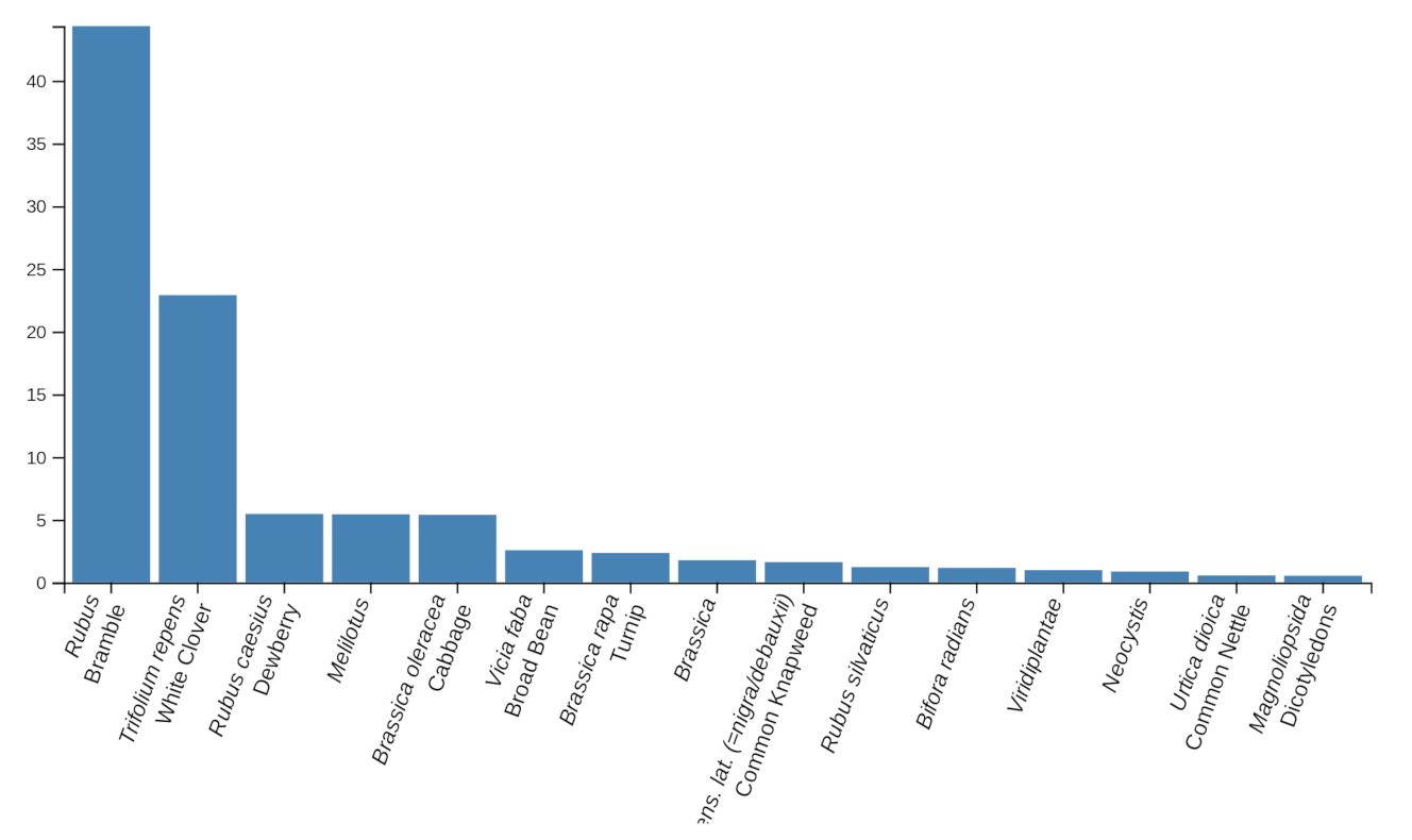 Anyhow, the verdict's finally in, and our 2020 crop appears to have contained only 24 identifiable varieties of pollen. In fact, if you group the brambly species (e.g. Bramble, Dewberry and Rubus silvaticus), the extent to which these predominate is striking. Clovers of varying types, along with brassicas, make up the majority of the rest ...